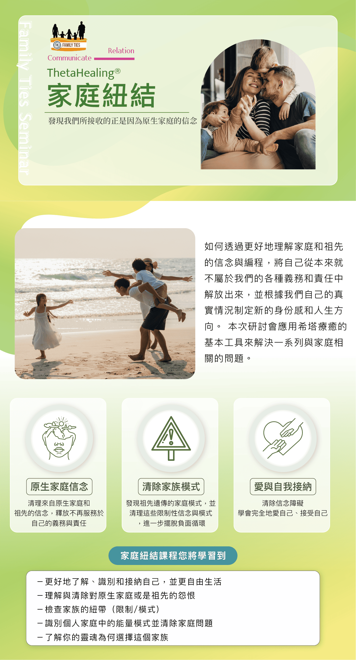 在此課程上,我們將注意力轉向內心,並發現我們所接收的正是因為原生家庭的信念。透過放棄不再為我們服務的信念,我們可以更好地了解、認識和接受自己,並過著更自由的生活。