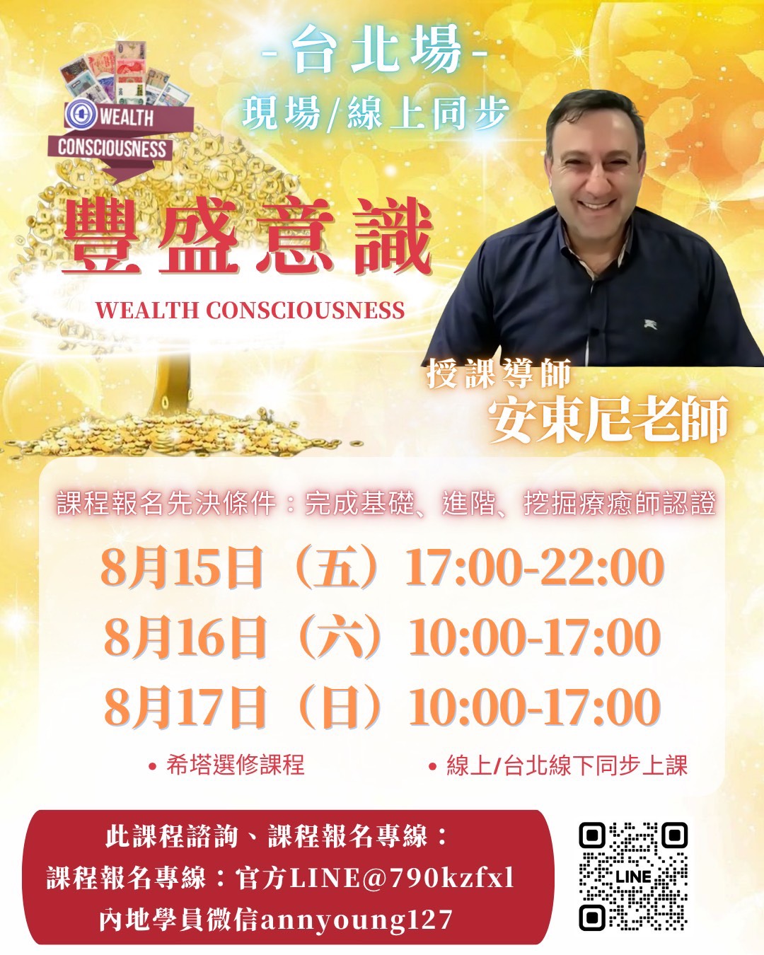 8/15 17:00-22:008/16-17 10:00-17:00安東尼老師 豐盛意識 台北場線下/線上同步